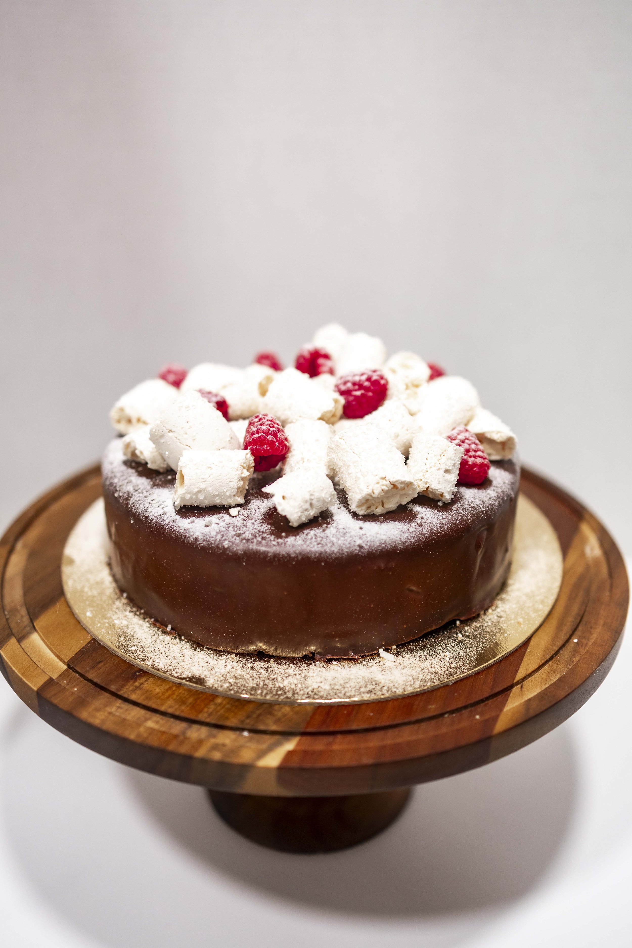Flourless chocolate cake with layers of chocolate mousse, covered in chocolate ganache, French meringues and fresh raspberries.