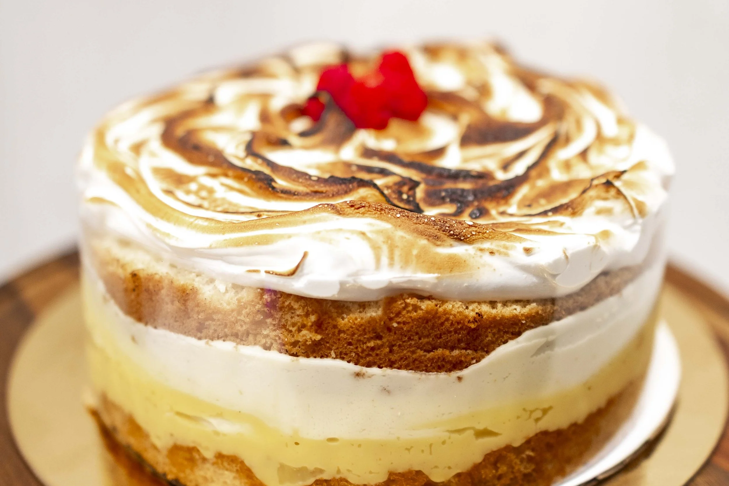 Three layers of pistachio dacquoise filled with rosewater mousseline and raspberry jam, topped with whipped cream, fresh raspberries and rose petals. Gluten free.